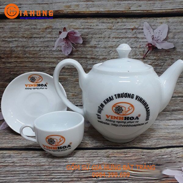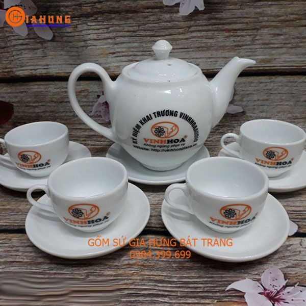 - 1 Ấm, 6 chén, 7 đĩa lót in logo theo yêu cầu