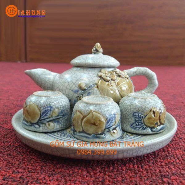 Bộ ấm chén thờ men rạn đắp quả đào gốm sứ Gia Hưng Bát Tràng