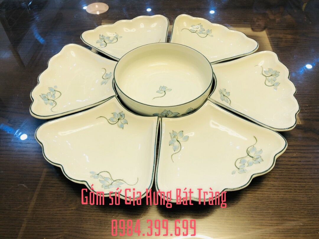 Bộ đĩa men kem sen xanh gốm sứ Bát Tràng