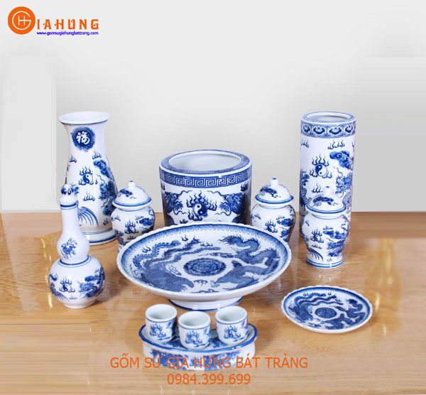 Bộ đồ thờ có nhiều món như bát hương, mâm bồng, lọ hoa, chén thờ, bát thờ, chóe muối gạo nước, bát thờ, chân nến, hồ lô thờ, ống hương, bát nước, nậm rượu thờ